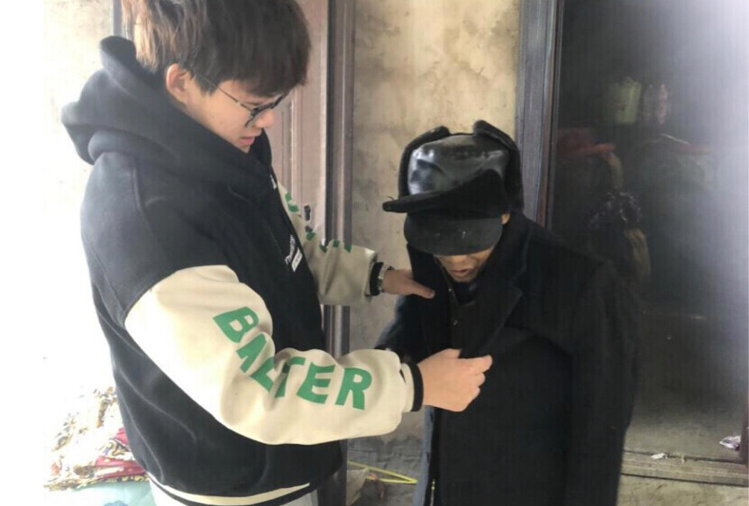 图为志愿者覃毅在帮老人试穿新衣覃毅供图