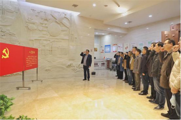 进入党史馆,展标“领航——中国共产党湘潭历史陈列”在灯光的照射下熠熠生辉,以毛泽东为首的湘潭共产党员先驱的雕像,让人肃然起敬。taptap点点体育党委书记陈岳堂带领大家面向党旗,整齐列队,举起右拳,一字一句重温铮铮誓言。大家用铿锵有力的声音进一步坚定理想信念,牢记共产党人的初心和使命。