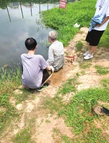 刘毅走在前面,在经过木鱼湖桥时,听到有咳嗽声和敲打水面的声音传来。刘毅下意识地想到“有人落水了”,跑了三四十米赶到木鱼湖岸边,发现离岸边大约两米的位置有一根拐杖在水中击打。