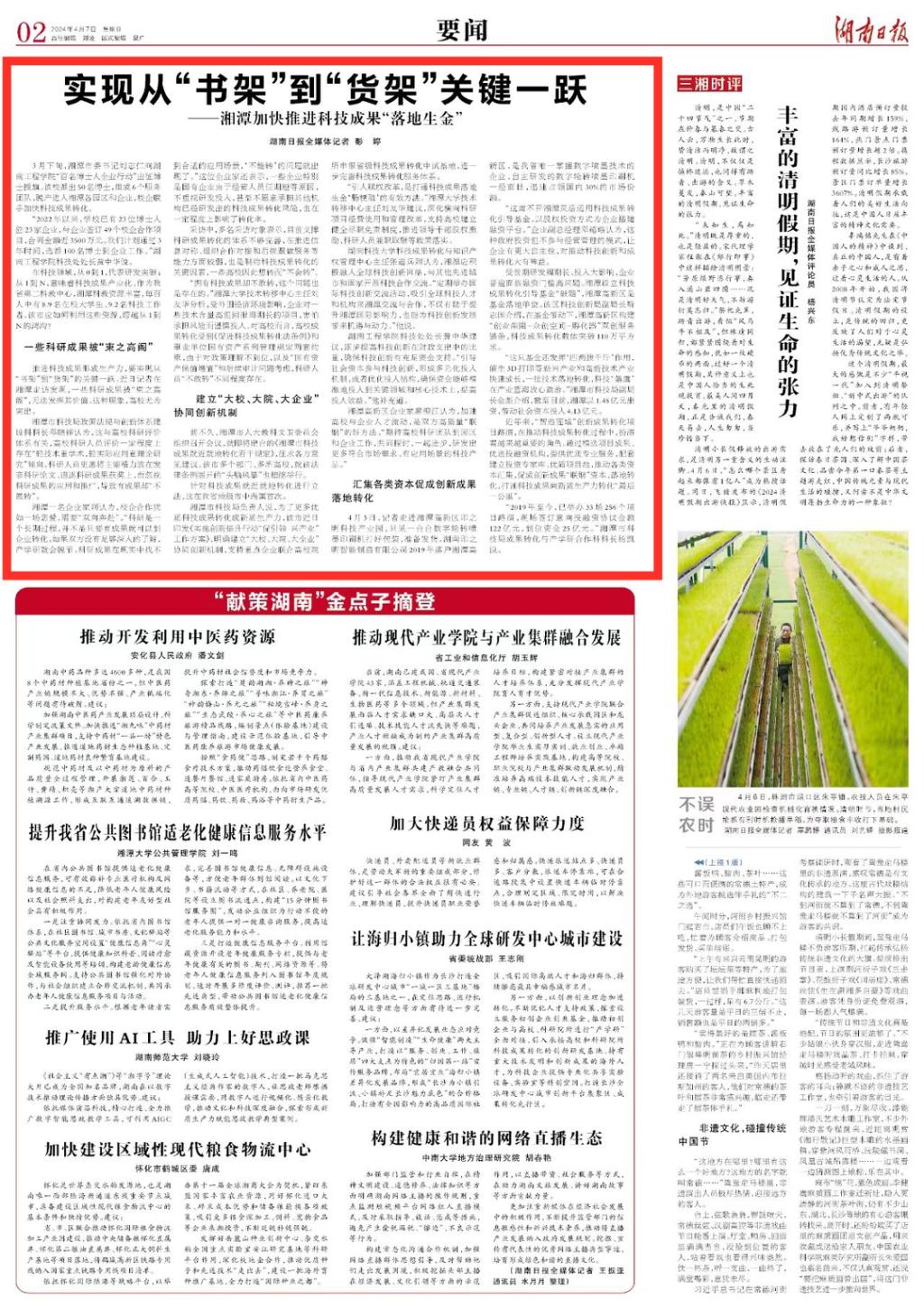 湘潭市科技局负责人说,为了更多优质科技成果转化成新质生产力,该市近日印发《实施创新提升行动“促引领 兴产业”工作方案》,明确建立“大校、大院、大企业”协同创新机制,支持重点企业联合高校院所申报省级科技成果转化中试基地,进一步完善科技成果转化服务体系。