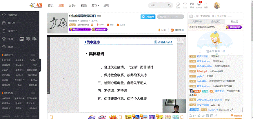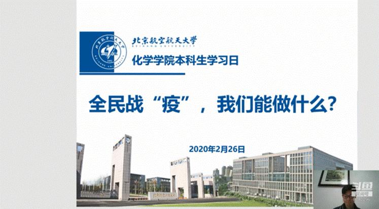 2月26日下午,德赢AC米兰中国官方网站本科生2016级、2017级、2018级召开学习日活动,活动主题为“全民战‘疫’,我么能做什么?”,本次学习日活动采用线上班会的形式,由辅导员在斗鱼直播平台主讲开展。
