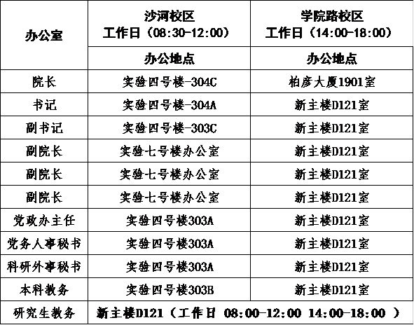 在搬迁期间为更好服务两校区学院师生,经学院党政联席会和搬迁工作领导会议审议决定从2020年12月21日(周一)起学院行政办公室试行两校区办公,即工作日上午在沙河校区集中办公(实验4号楼303办公室),下午在学院路校区办公(新主楼D121办公室)。两校区办公试运行中可能出现的问题敬请广大师生谅解,并请及时与学院党政办主任联系以便持续改进。详细办公安排如下: