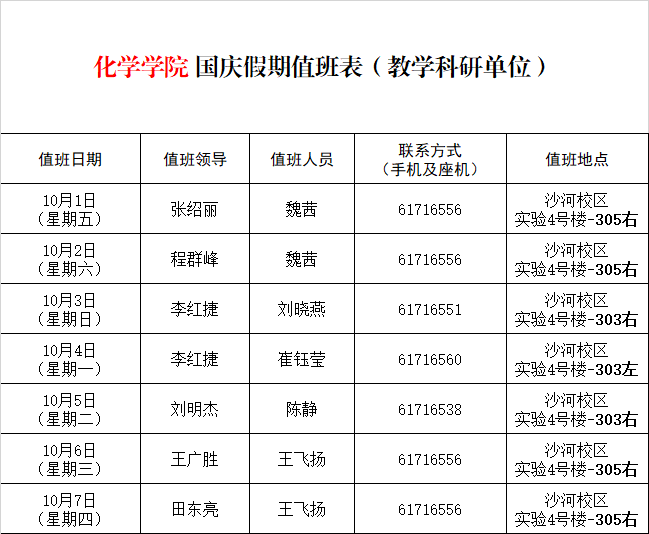 按照学校相关规定,结合学院工作实际,现将国庆期间值班安排通知如下: